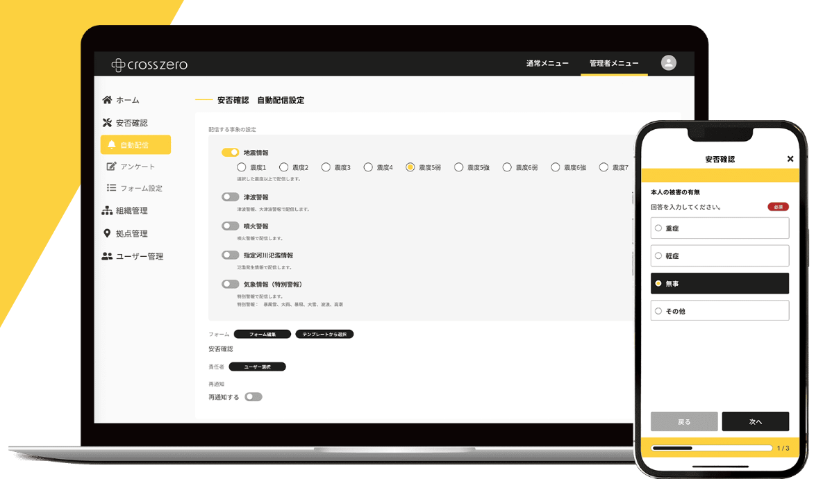 クロスゼロは、気象庁の災害情報と連携し、地震・津波・大雨などの発生時に自動で安否確認を配信。AIがSNSから発災状況を収集し、ニュースでは得られない身近な災害情報も把握可能です。安否確認は社員だけでなく家族にも対応し、企業のBCP(事業継続計画)を強力にサポートします。