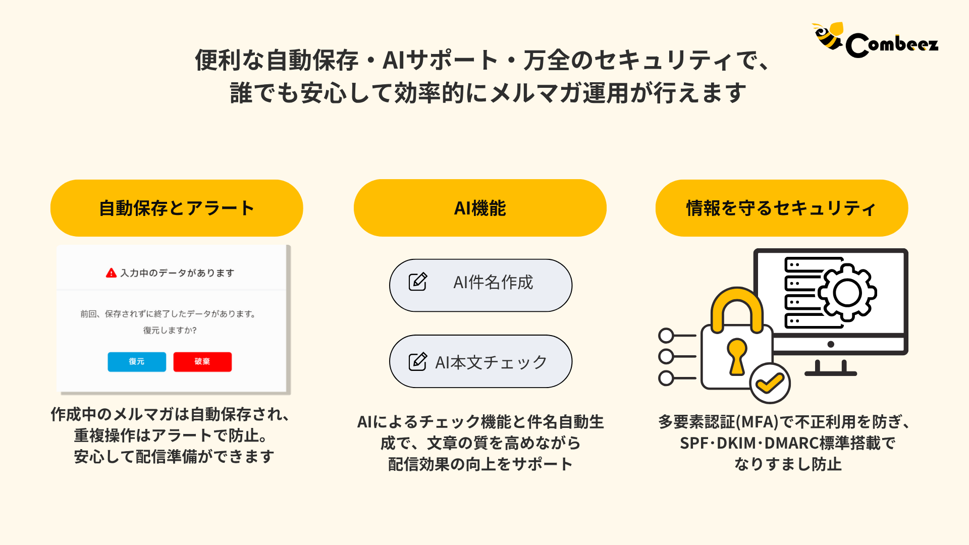 便利な自動保存機能とAIサポート、そして万全のセキュリティで、誰でも安心してメルマガ運用が行えます。 ① 自動保存とアラート機能 作成中のメールは自動で保存され、閉じてもすぐに復元OK。重複操作はアラートで防止し、作業ミスを軽減します。 ② AIサポート機能 AIが本文をチェックし、内容に合った件名を自動で提案。文章の質と開封率アップを同時にサポートします。 ③ セキュリティ対策 多要素認証(MFA)で不正利用を防ぎ、SPF・DKIM・DMARC対応でなりすましをブロック。安心して配信できます。