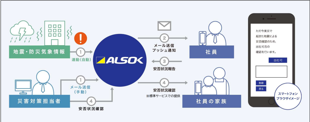 ALSOKが提供する安否確認サービスは、地震や特別警報が発令された際に自動で配信される安否確認通知を提供します。ユーザーはアプリを通じて安否状況を報告でき、写真や音声を添付することも可能です。このサービスは、安否確認の迅速性を高め、従業員や家族の安全を確保するために設計されています。さらに、災害時の行動マニュアルやBCPマニュアルなどの資料も添付可能で、多様なシーンで活用できます。