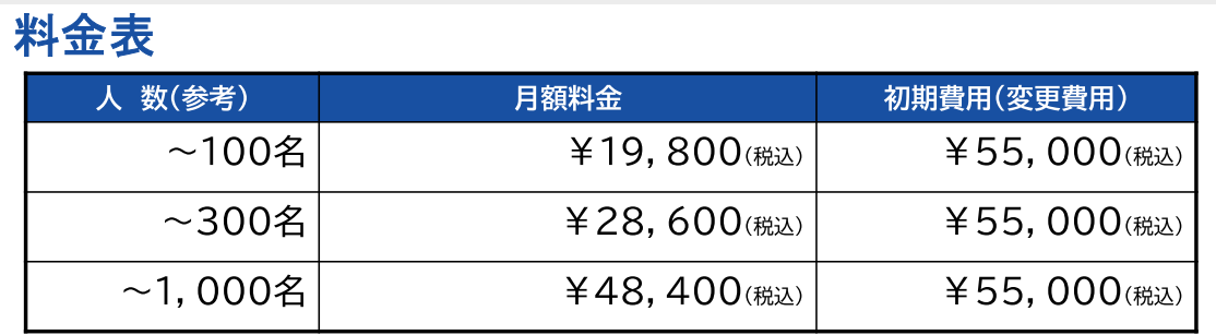 100名まで初期費用55 000円、月額19 800円; 500名まで初期費用55 000円、月額37 400円; 1 000名まで初期費用55 000円、月額48 400円