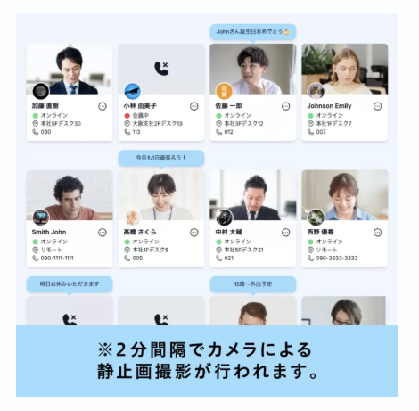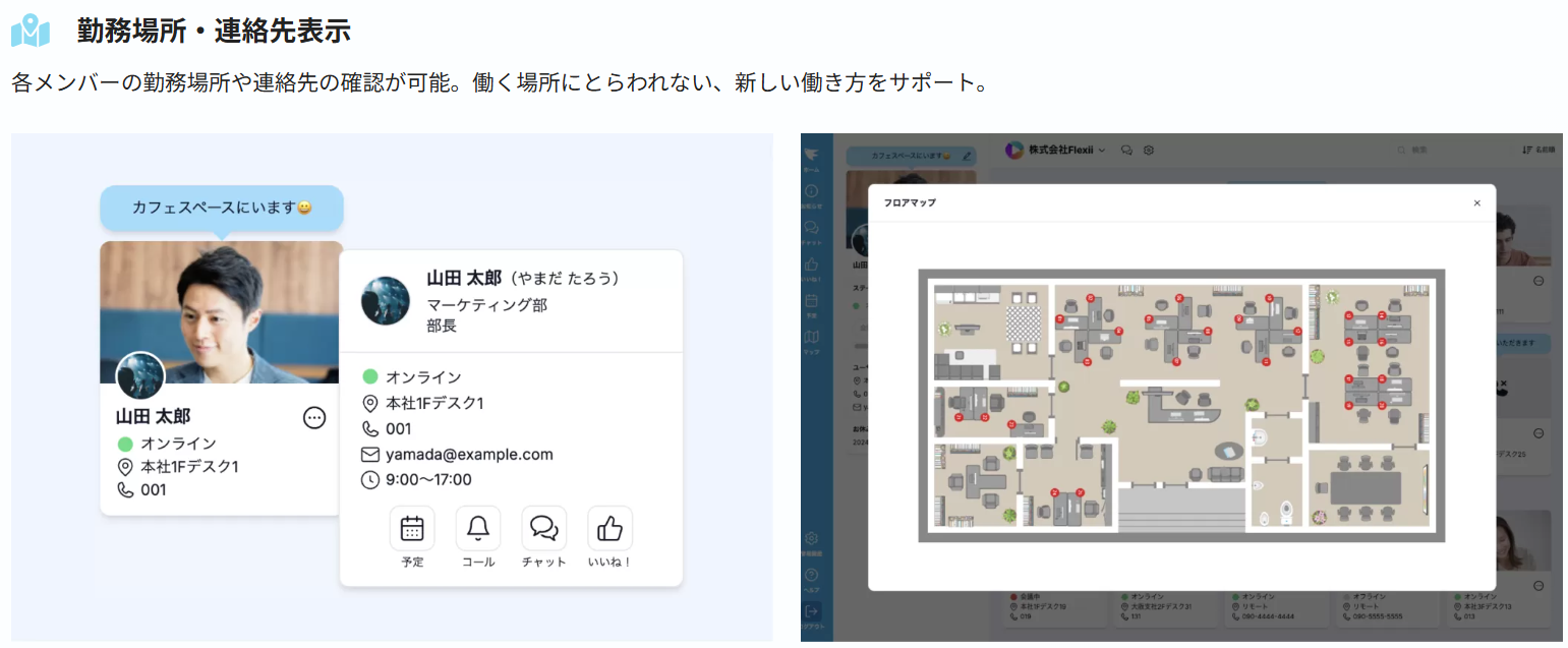 Flexiiは、出社・テレワークを問わず、チーム全体が一体になって業務を進めることを可能にするバーチャルオフィスシステムです。リアルタイムでメンバーの状況を把握でき、顔を見ながらのコミュニケーションを実現。これにより、孤立感の軽減やモチベーションの向上が期待できます。さらに、各メンバーの勤務場所や連絡先を容易に確認でき、柔軟な働き方をサポートします。