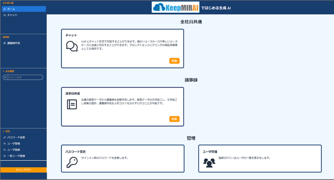 「KeepMIRAI」は、業種別のテンプレートを提供し、直感的な操作で専門知識がなくても高精度な回答を得られます。さらに、管理画面により利用状況を可視化できるため、企業内での活用が促進されます。初回リリースではチャット機能と議事録機能が利用可能で、今後も機能拡張を予定しています。