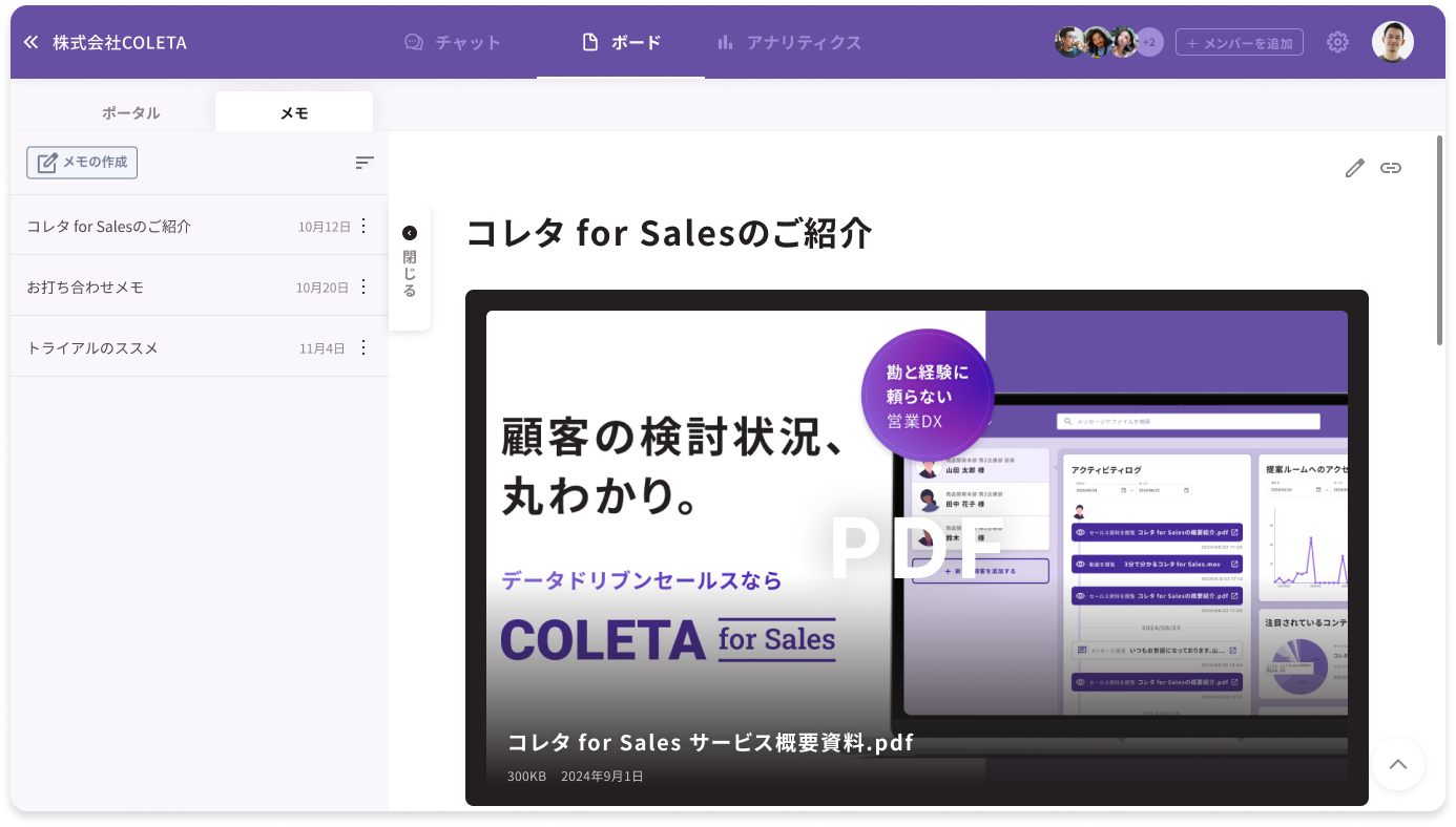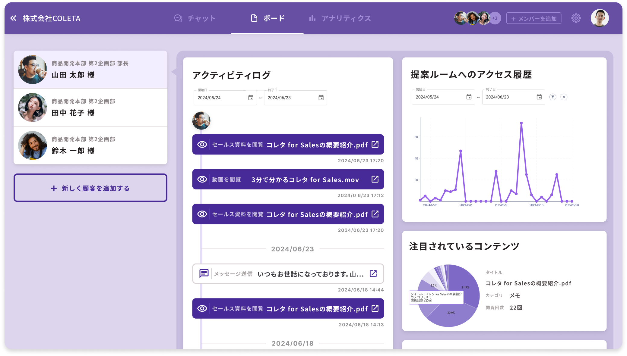 担当者・キーマンの興味関心を、PDFのページ単位までトラッキング。コレタAIが“顧客に刺さる”提案をサポートし、成約率を飛躍的に向上させることができます。