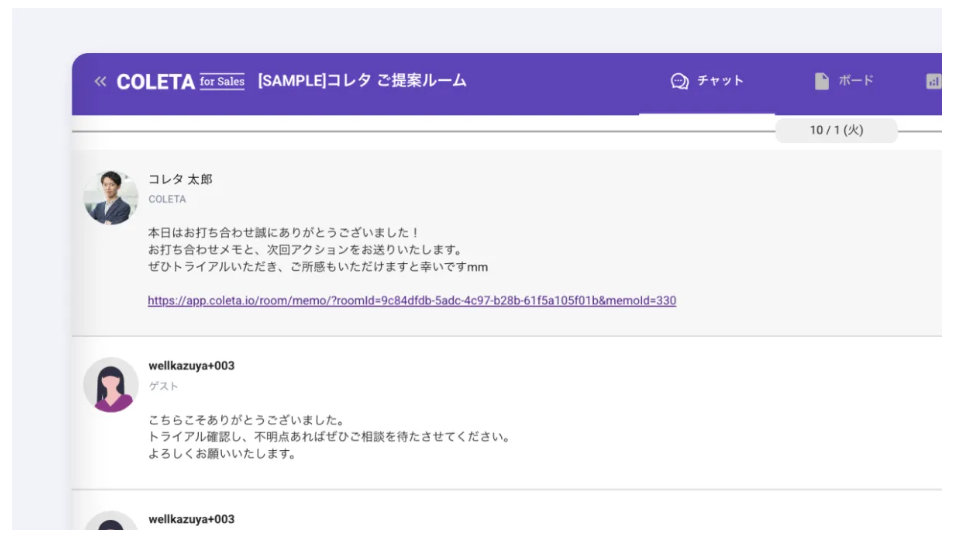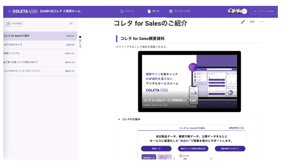 コレタ for Salesは、商談ごとに“顧客専用ページ”を作成し、提案資料・見積・議事録・FAQ・動画などを一箇所に集約して共有できるデジタルセールスルーム(DSR)です。顧客の資料閲覧・再訪・滞在時間・動画視聴などの行動をリアルタイムで可視化し、購買サインを通知。メールやチャットが散在せず、最新の提案セットを常に提示できます。テンプレート化・タスク化で進め方を標準化でき、新任でも再現性の高い提案運用が可能。既存顧客の追加提案、更新・アップセルの兆候検知にも強く、成約率向上と工数削減を同時に実現します。