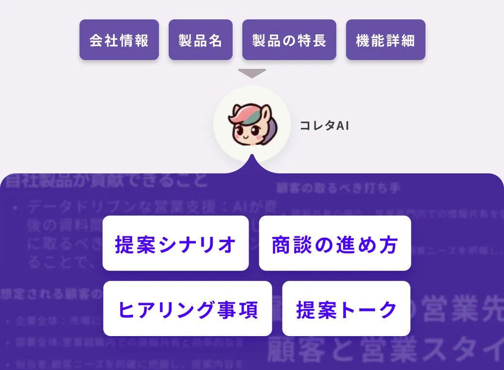 AIが企業や顧客の情報を徹底的に分析し、最適なトークを自動生成。これにより、誰でも準備万端で商談を始められる環境を提供します。