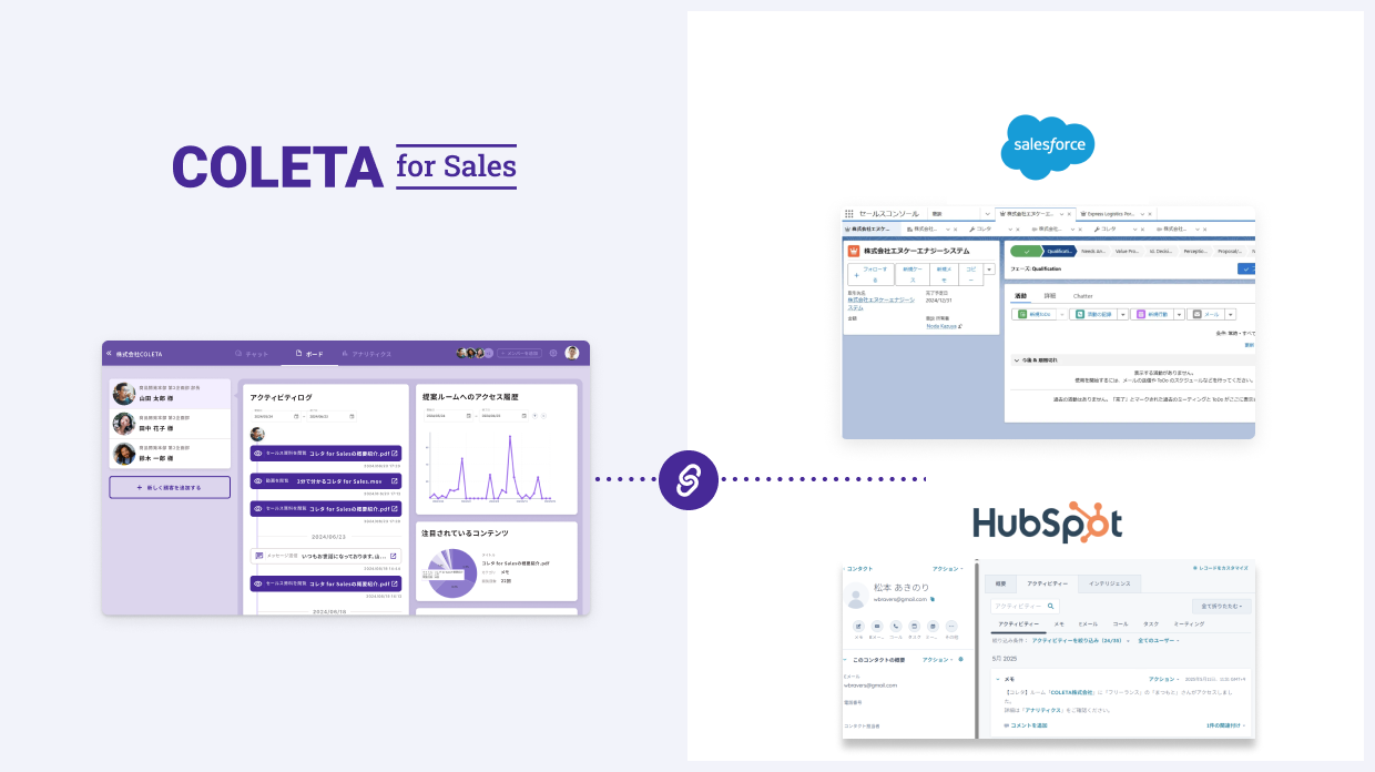 コレタのアナリティクスログやチャット履歴、商談情報がSalesforceやHubSpotなどのSFAに自動連携。 顧客とのやり取り情報を手間なくSFAへ一元化できます。