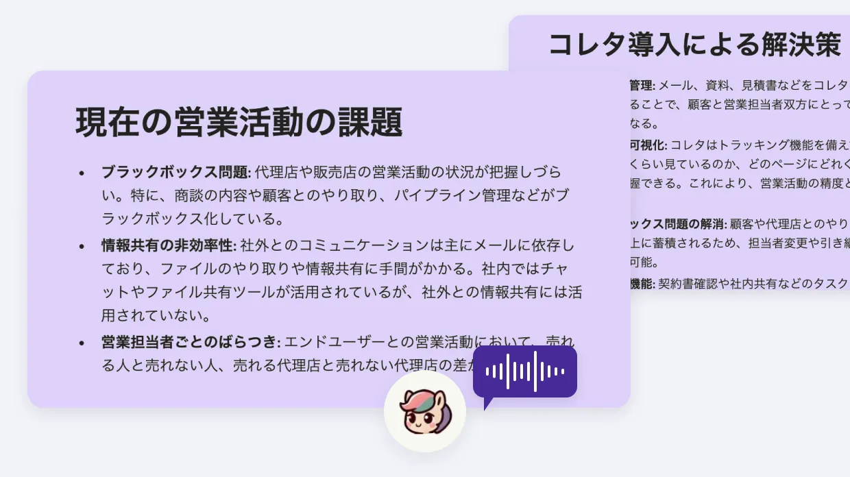 資料やメモなどの提案コンテンツを一元化し、全く新しい営業体験を提供。加えて、商談内容を文字起こし・要約も自動化されるので、営業担当者が顧客との対話に集中できます。