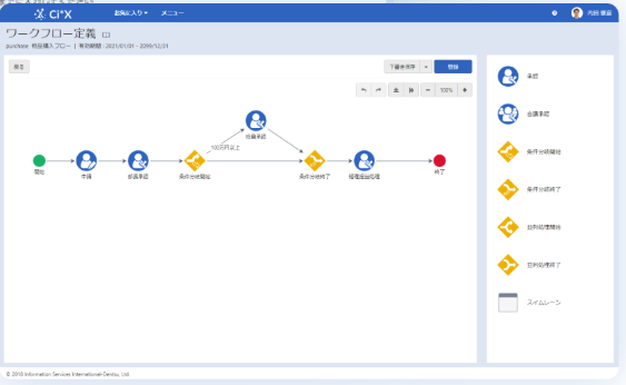 Ci*XWorkflowでは、ユーザーが直感的にワークフローを設計できるよう、ドラッグ&ドロップのインターフェースを採用しています。これにより、技術的な知識がなくても、容易にプロセスを定義し、カスタマイズすることが可能です。シンプルな画面設計で、業務の複雑さを軽減します。